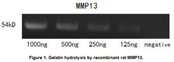 基质金属蛋白酶(Matrix Metalloproteinase)是一组具有多种共同生化性质的可以降解细胞外基质的酶,它们参与正常生命过程中结缔组织的再造。基质金属蛋白酶的降解作用在中性pH条件进行,需要有内在的Zn2+离子和外在的Ca2+离子存在;且酶活能被螯合剂和金属蛋白酶的组织抑制因子(Tissue Inhinbitor of Metalloproteinase,TIMP)所抑制。 基质金属蛋白酶13(MMP13)是基质金属蛋白酶家族的成员,研究表明MMP13参与与骨关节炎相关的聚集蛋白聚糖降解,骨关节炎软骨移植物中II型胶原蛋白的裂解,以及肿瘤的进展和转移。另外,MMP13还可以切割I,III,IV,IX,X和XIV型胶原蛋白和纤连蛋白。MMP13在细胞外基质降解和细胞-基质相互作用的调节中起关键作用。 我们使用明胶酶谱法检测了MMP13的活性。具体步骤如下: 1.制备不同浓度的MMP13,1000ng,500ng,250ng,125ng; 2.向不同浓度的MMP13中加入用SDS上样缓冲液; 3.在非还原条件下,将不同浓度的MMP13和阴性对照(热变性的MMP13)上样电泳,使用含明胶(1mg / mL)的十二烷基硫酸钠-聚丙烯酰胺凝胶(SDS-PAGE,10%凝胶); 4.复性,孵育,CCB染色。 结果:活性MMP13会水解凝胶中的明胶,由凝胶上的白色条带指示。 重组MMP13的明胶水解如图1所示。