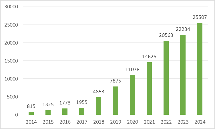 如今,Solarbio产品宛如科研舞台上的璀璨明珠,备受瞩目。截至目前为止,全网共计收录引用Solarbio产品的SCI文献达115084篇,总影响因子高达639305.45最高因子高达82.9。这一系列的辉煌数据,铭刻着大家与索莱宝的一路相随与相伴。下图分别为引用Solarbio产品近十年年度及2024年各月度SCI文献数量分布。