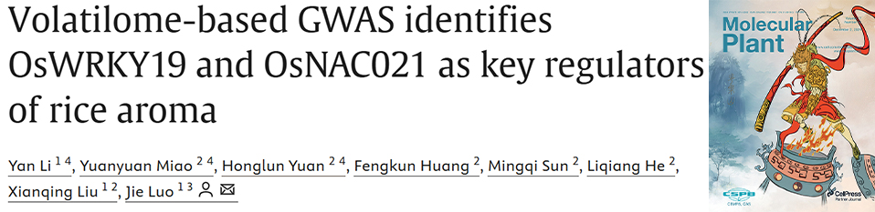 标题:Volatilome-based GWAS identifies OsWRKY19 and OsNAC021 as key regulators of rice aroma
