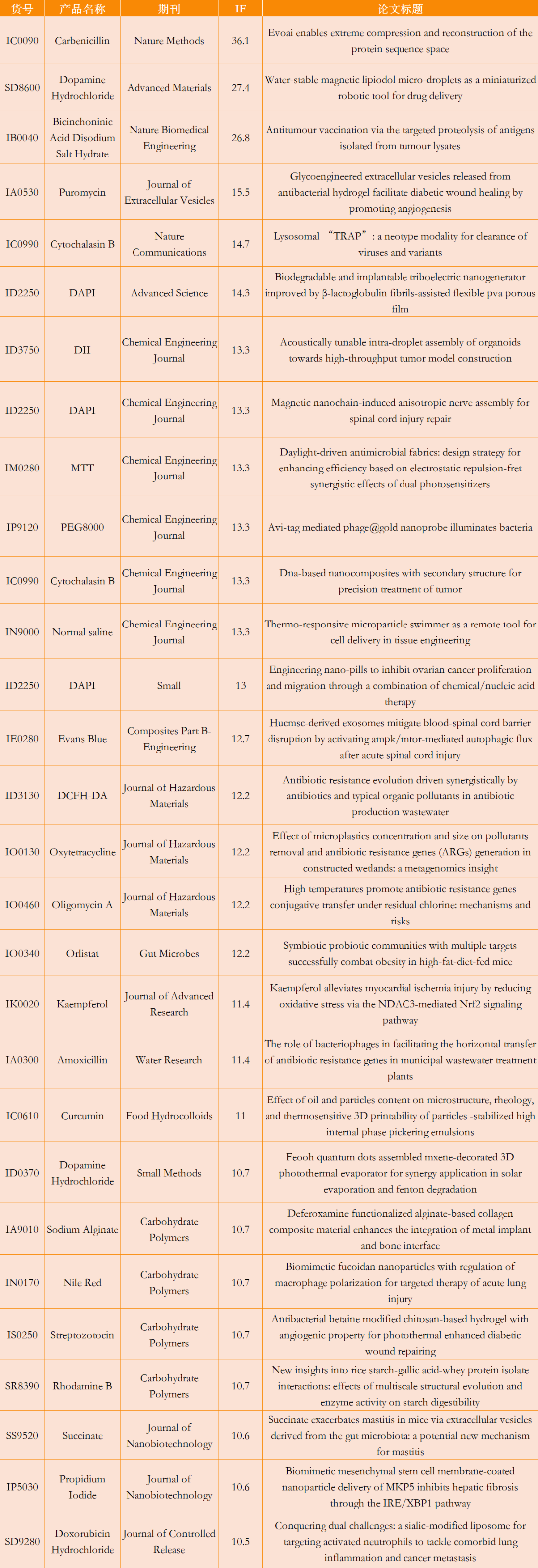 在本月中,Solarbio产品的表现尤为突出。单月引用文献达2074篇,单月引用产品数量达2991个;单月总影响因子为12859.3,最高影响因子高达50.5。其中单月影响因子20+的文献多达20篇,影响因子10+的文献更是多达278篇。这一系列数据不仅体现了本月Solarbio产品在科研领域的高频次应用,更反映了在高影响力学术研究中的突出贡献,体现了我们在科研领域强劲的发展势头和广阔的发展前景。