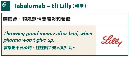 2014年十月,在红斑性狼疮适应症新药tabalumab,啟动的另一个临床三期试验第二个指标失败后,礼来(Eli Lilly)($LLY)终於中止了其研究计画。礼来為tabalumab的类风湿性关节炎适应症及狼疮适应症,分别损失了5,000万美元及7,500万美元。