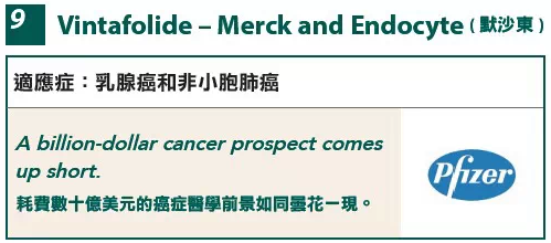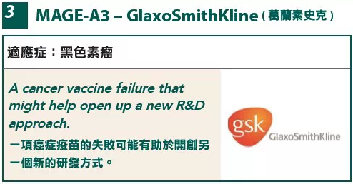 某些未来药物发展的大趋势,也自这些药物计画的残骸中逐渐崭露头角。过去一年中,已有证据显示癌症疫苗单独治疗的效果不彰,癌症疫苗联合免疫检查点抑制剂(Immune check-point) 的鸡尾酒疗法可能成為下一波发展的趋势。