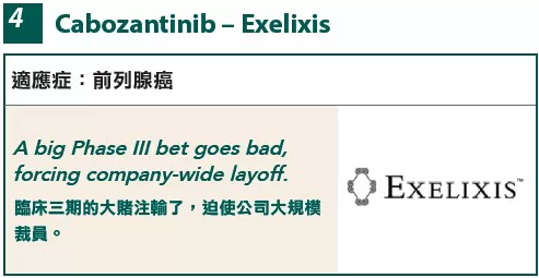 Exelixis遭遇的重大问题是,前列腺癌药物Cabozantinib的首次大规模临床三期在2014年9月溃败,这项消息不仅衝击股价,也引发公司经营策略的危机。面对这次失败,研究人员停止招募COMET-2的人才,也造成Exelixis裁员约7 成的生技部门员工,但计画仍将於年底检验总结果。