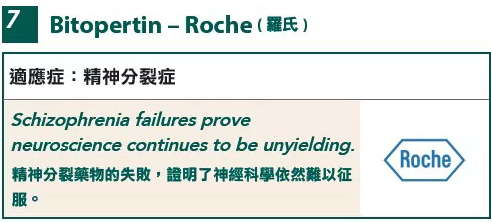 但最近,他们几乎要对精神分裂症用药、第一型甘胺酸运输体抑制剂bitopertin的临床三期放弃希望。他们雄心勃勃的6个临床三期方案中,3个未达到主要目标,并且在第一季就被中断。剩下的3个,有2个在四月被中断,第三个持续中的临床三期则将重点放在包括幻觉和妄想的次优控制症状(suboptimally controlled symptoms)。