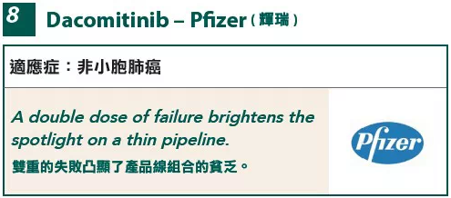 dacomitnib是口服的泛HER抑制剂,用来阻止蛋白质修饰和中断肿瘤信号传导,进而杀死肿瘤细胞。辉瑞充满野心的后期计画中,分别研究此药与EGFR 阻滞剂Tarceva和安慰剂的能力对比,但却发现相较於对照组,没能显著延长无恶化存活期(progression-free survival)或整体存活率。