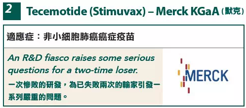不过,Merck KGaA在癌症疫苗tecemotide (Stimuvax)的再次失败,已使一些分析家怀疑,规模较大的药厂仍有根深蒂固的想法,拒绝承认其於临床上的错误。MerckKGaA抗白血病药物cladrabine的惨败,加上买断雪兰诺(Serono)几年后其研发虚弱,数十亿美元的投入是否就此白白浪费,使人存疑。