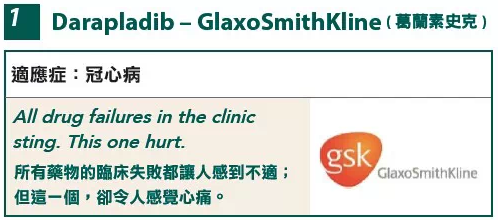 GlaxoSmithKline($GSK)在治疗动脉粥样硬化药物darapladib的研发投入许多,两次大型临床三期试验共招收3万例心臟病患者,并追踪超过两年。