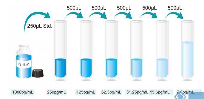 3. 标准品梯度稀释:加入标准品/样本稀释液(SR1)1ml至冻干标准品中,静置15分钟待其完全溶解后轻轻混匀(浓度为1000pg/ml),然后在其余七管中各加入500L标准品/样本稀释液(SR1),按照以下浓度进行2倍稀释:250(750ul SR1液+250ul标准品原液)、125、62.5、31.25、15.625、7.8、3.9、0 pg/ml进行稀释。250pg/ml为标准曲线最高点浓度,标准品/样本稀释液(SR1)作为标准曲线的零点(0pg/ml)。复溶过的标准品原液(1000pg/ml)未用完的应废弃或根据需要按照一次用量分装,并将其贮存在-20~-80℃冰箱,具体如下图。