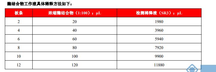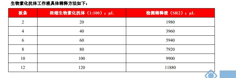 4. 生物素化抗体工作液:预先计算好试验所需用量,用检测稀释液(SR2)将100倍抗体浓缩液稀释成1倍应用工作液(稀释前充分混匀),请在30分钟内加入到反应孔中