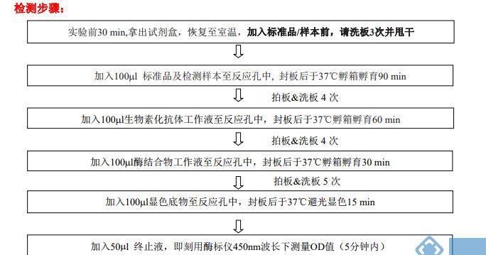 1. 试剂回温:首先在实验前 30 min 将试剂盒,待测样本放置于室温下,浓缩洗涤液如出现结晶,请放入 37℃温浴直到结晶全部溶解。