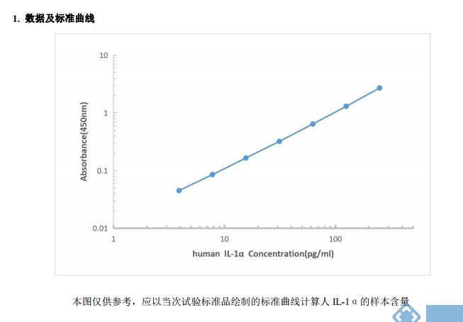 3.以标准品浓度为横坐标,吸光度OD值为纵坐标,用软件绘制标准曲线,样品中IL-1α含量可通过对应OD值由标准曲线换算出相应的浓度。